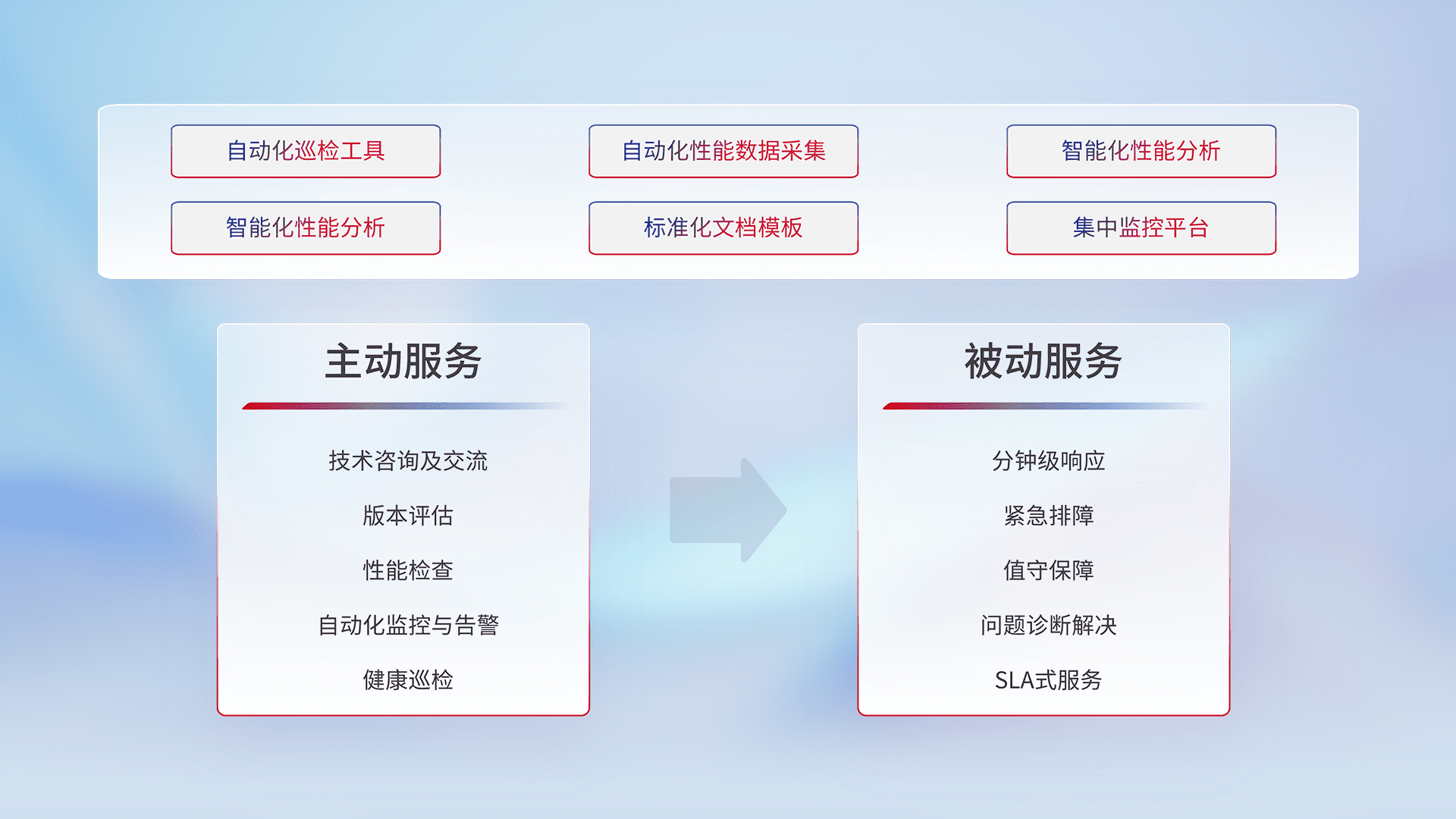 智能化工具和标准化文档,,,保障服务质量,,提供主动服务(包含技术咨询、、、、版本评估、、、性能检查、、自动化监控与告警、、健康巡检)和被动服务包含(分钟级响应、、、紧急排障、、值守保障、、、问题诊断解决、、、、SLA服务)。。。